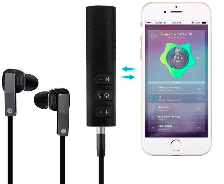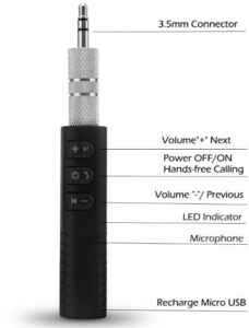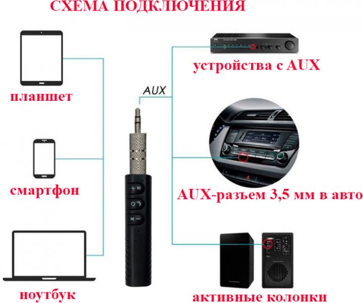 Адаптер ресивер Dynamode BT-AUX — Bluetooth 4.1 аудио AUX 3,5 mm — работает как аудио приёмник-ресивер посредством приёма аудио сигнала от bluetooth-устройства и передачи его на колонки магнитолы в автомобиле при наличии разьема AUX 3.5 мм на магнитоле, также на проводные наушники. Чаще всего данный адаптер BT-AUX используется в автомобилях как громкая связь для приема звонков, т.к. в нем есть встроенный микрофон, также он позволяет проигрывать MP3-треки с телефона на динамики автомагнитолы, например, это особенно актуально, если в вашем авто нету USB-разъема для флешки.