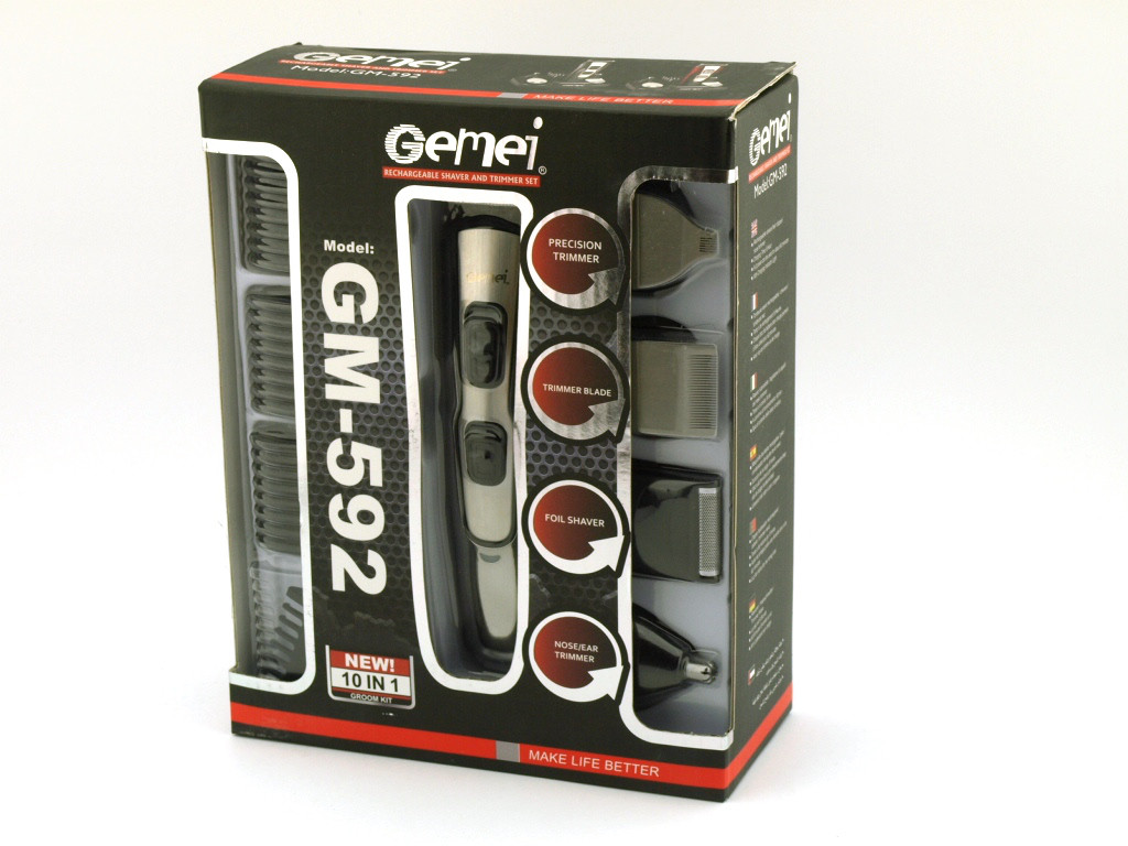 Профессиональный набор для стрижки волос Gemei Profiline 10 в 1 сочетает в себе бритву, триммер для носа и ушей, машинку для стрижки с 4 сменными насадками (3мм, 6мм, 9мм, 12мм), насадку для подравнивания бороды и бакенбард. Имеет 2 скорости работы в турбо режиме.