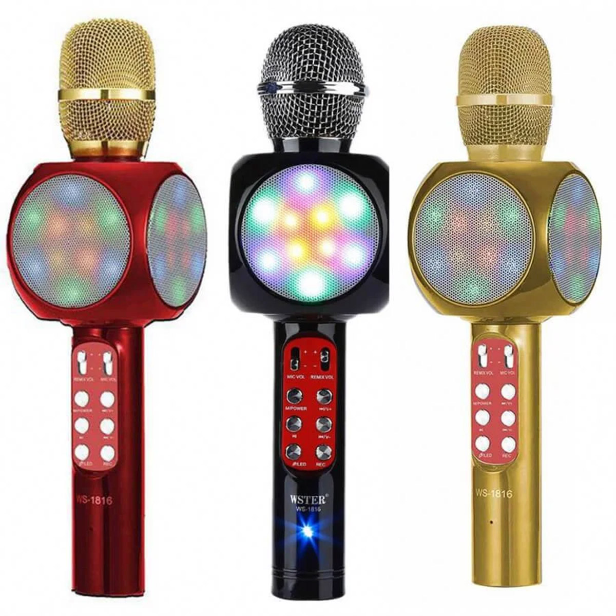 Микрофон WS-1816 Mix — то что Вам необходимо. Микрофон WS-1816 Mix — обновленная версия, с еще более качественных материалов. Беспроводной микрофон bluetooth WSTER WS-1816 Вам нравится караоке и Вы хотите от души петь популярные песни, но не хочется куда-то идти? Вы любите проводить время на природе или в дружной компании на дому у знакомых? Тогда вам просто необходим WS1816! Такое устройство поможет создать праздник и порадовать друзей в любой месте.WS1816 представляет собой комбинацию динамика и микрофона, который можно использовать как плеер или караоке-микрофон в комбинации со смартфоном. Соединение с гаджетом происходит без проводов, по технологии Bluetooth. Портативный прибор имеет минимальные размеры: длину всего 26,5 см и вес 415 грамм. А встроенная батарея на 1800 мАч обеспечивает 11-14 часов непрерывной работы, выдавая звук мощностью до 115 Дб. Поэтому можно использовать устройство в самой разной обстановке, чтобы обеспечить веселье и праздничное настроение компании на любой вечеринке.Объединение в одном устройстве микрофона и динамика позволяет одновременно проигрывать музыкальные треки со своего смартфона (или любого гаджета, работающего через Bluetooth). В ящике — белый-5/красный-5/черный-15/золотой-15 Микрофон WS-1816 Mix — рекомендуем к покупке. Для заказа просим либо сделать заказ через корзину, либо звонить по телефону, либо писать в Вайбер.