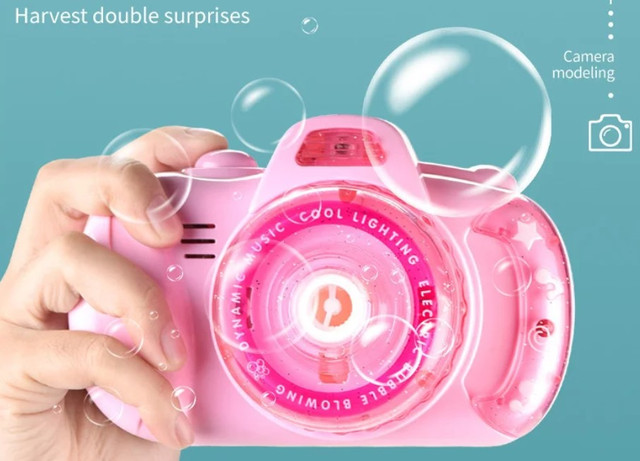Машинка для создания мыльных пузырей Bubble Camera 999 – которое приведет в восторг не только детей, но и взрослых. При помощи такого приспособления можно выдувать большое количество шаров. Для этого необходимо вставить батарейки в установку, налить раствор в емкость и нажать кнопку запуска.