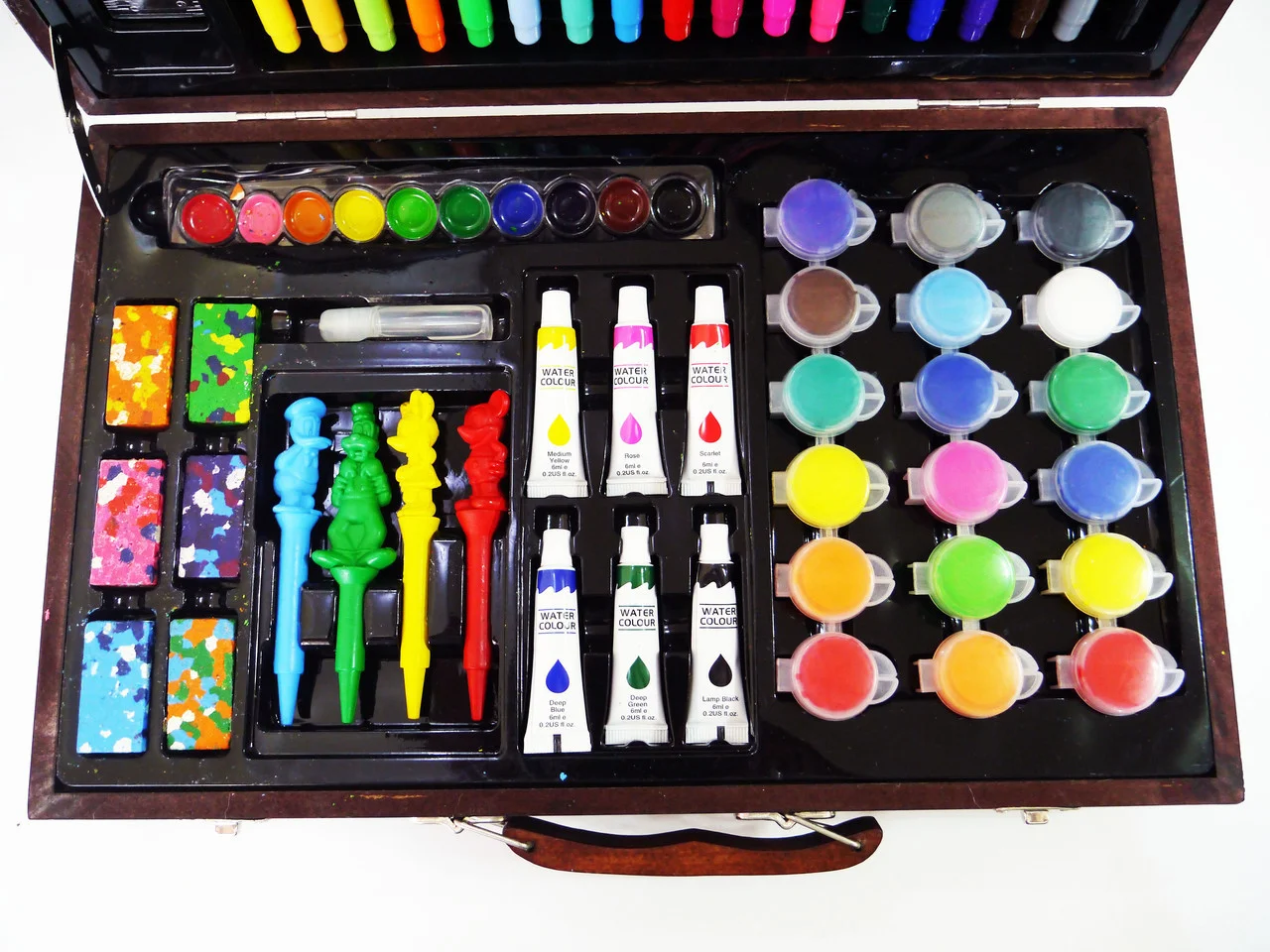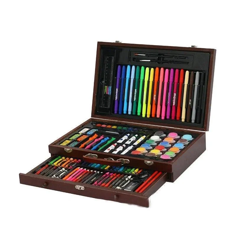 Набор для юного художника в деревянном кейсе на 130 предмета (цветных фломастеров, красок, мелков, карандашей для рисования и канцелярскими принадлежностями). Этот супер мобильный художественный набор понравится не только детям, но и их родителям!