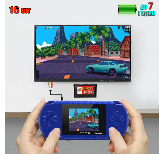 Это компактная и доступная игровая консоль, которая имеет популярные встроенные 16-битные игры. Консоль помещается в карман, поэтому всегда с вами работает как от сети, так и от аккумулятора, обеспечивающего питание в течение 6-7 часов игрового процесса, а также возможность подключения к ТВ.