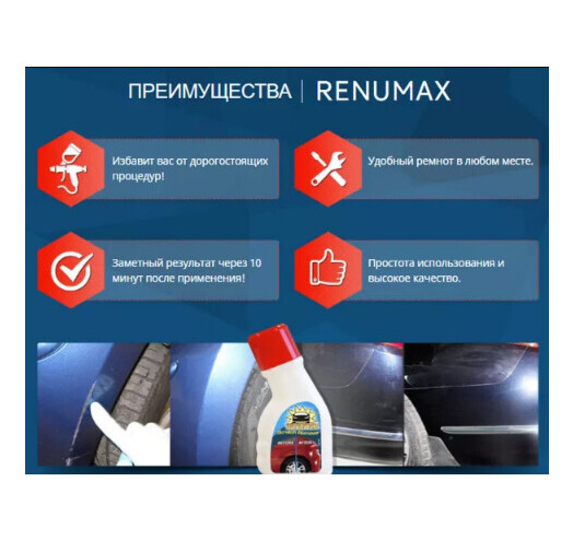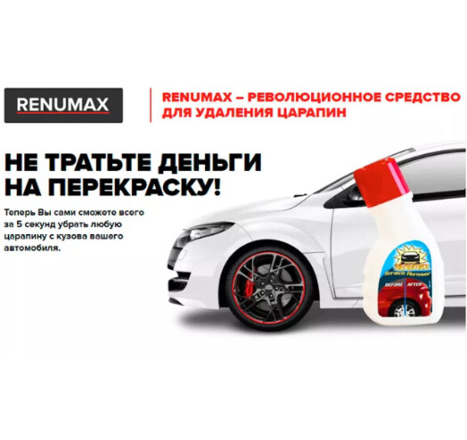 Renumax – борец с царапинами на вашем автомобиле Renumax – инновационный прорыв в борьбе с различными видами царапин на авто. Средство для удаления царапин, на сегодняшний день не имеет аналогов. Кто не ездит на машине, тот не царапает ее. Многие автолюбители просто теряют голову от появления скола или царапины на поверхности машины. Но Renumax позволяет очень быстро, и без финансовых затрат, устранить такую неприятность, как повреждение лакокрасочного покрытия на автомобиле. Данное средство способно удивить даже заядлых скептиков в области ремонта и сохранности автомобилей.