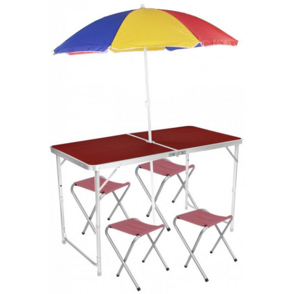 Стол изготовлен из алюминиевого профиля, что значительно облегчает его транспортировку. Столешница из ламинированного ДСП, длиной 120 см, шириной 60 см. Высота стульев 34 см, ширина 27 см. Такой стол выглядит красиво и эстетично, а также очень удобен в эксплуатации. Столешница прочная, легко моется, устойчива к механическим повреждениям. в комплекте к столу идут 4 раскладных стула. Основание изготовлено из алюминиевого профиля, сиденья — из ткани «Оксфорд». Она хорошо стирается, устойчива к растяжений и деформаций. Стулья могут выдерживать нагрузку до 100 кг.